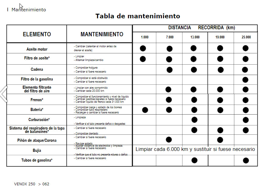Aquí tienes lo que pone en el manual del usuario, para que tengas una referencia, puedes ver los manuales de usuario y taller completos en nuestra web www.clubvenox.es dentro de la sección LA MOTO.